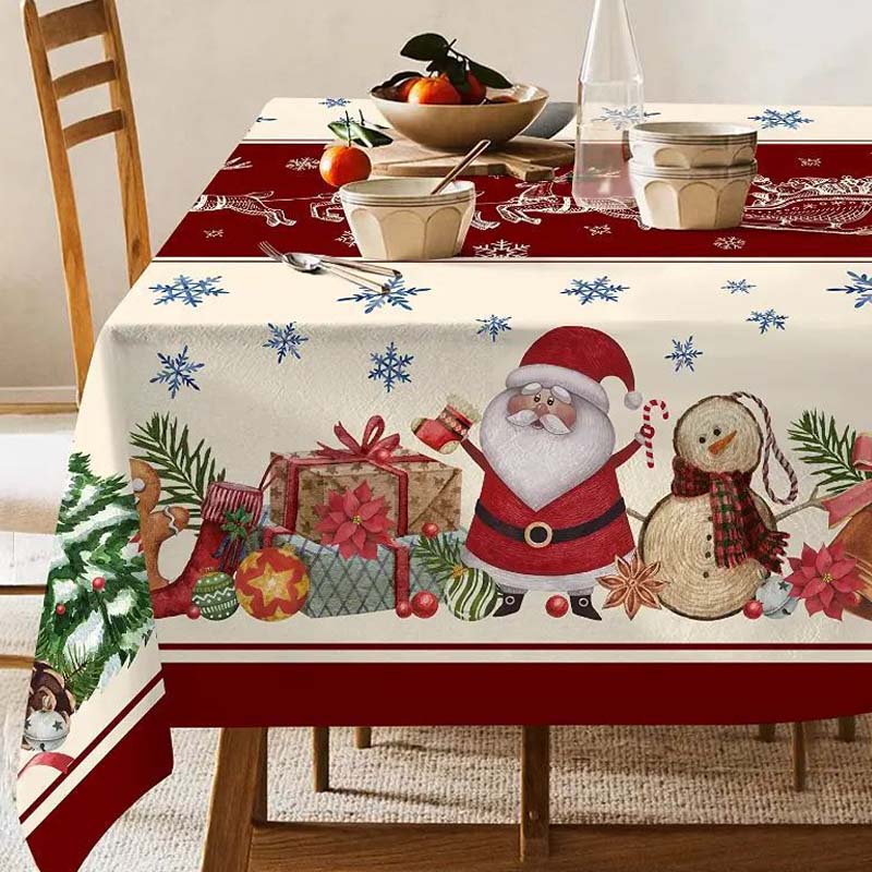 CREËER EEN FEESTELIJKE SFEER: Transformeer uw dinerervaring met ons kersttafelkleed, ontworpen om de warmte en charme van uw feesttafel direct te verhogen. Met feestelijke patronen van de Kerstman en sneeuwpoppen vormt dit tafelkleed de perfecte achtergrond voor familiebijeenkomsten en vieringen. Maak uw kerstdiners onvergetelijk en visueel aantrekkelijk en creëer een uitnodigende ruimte voor uw dierbaren.