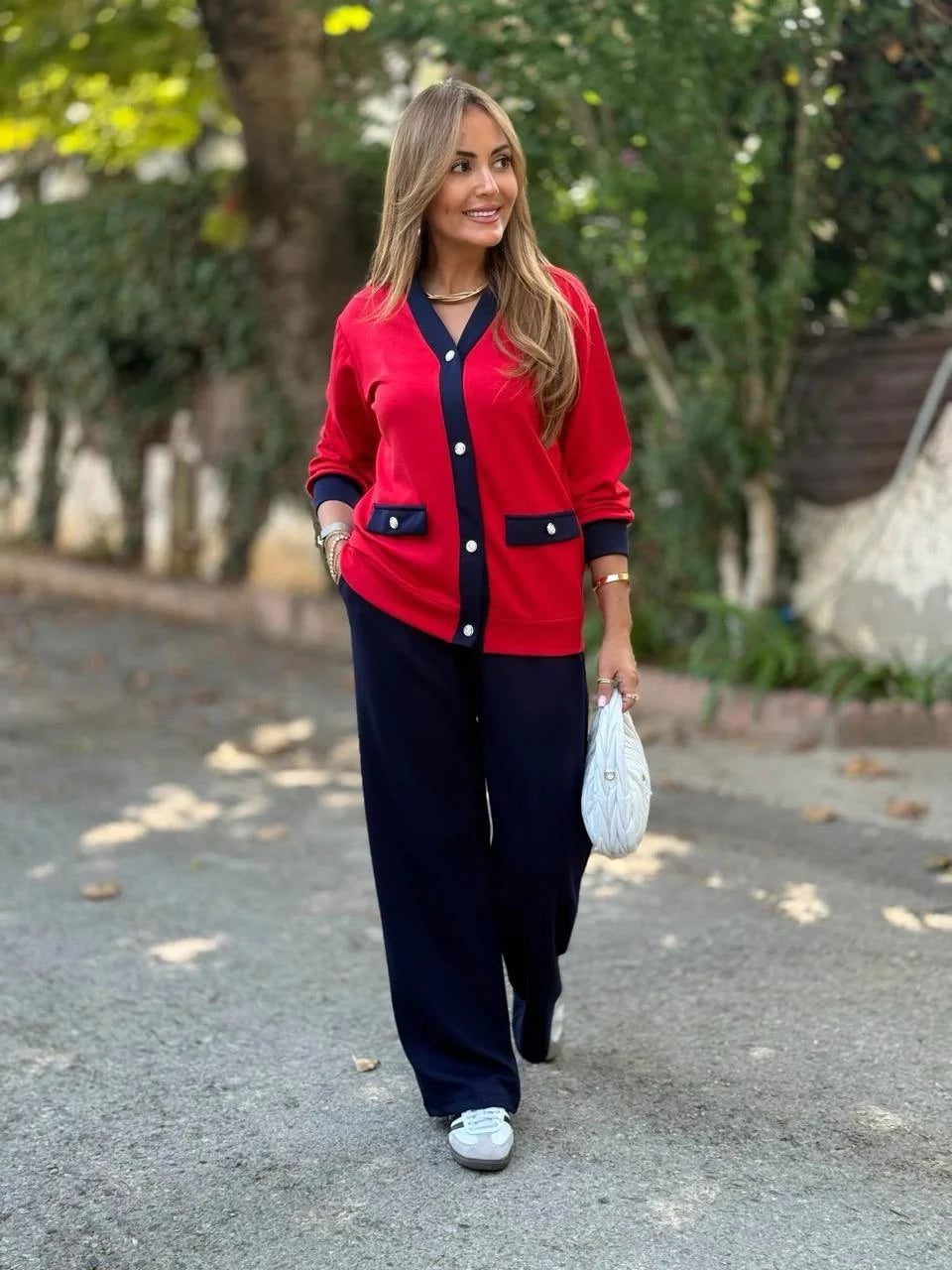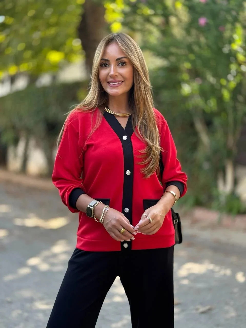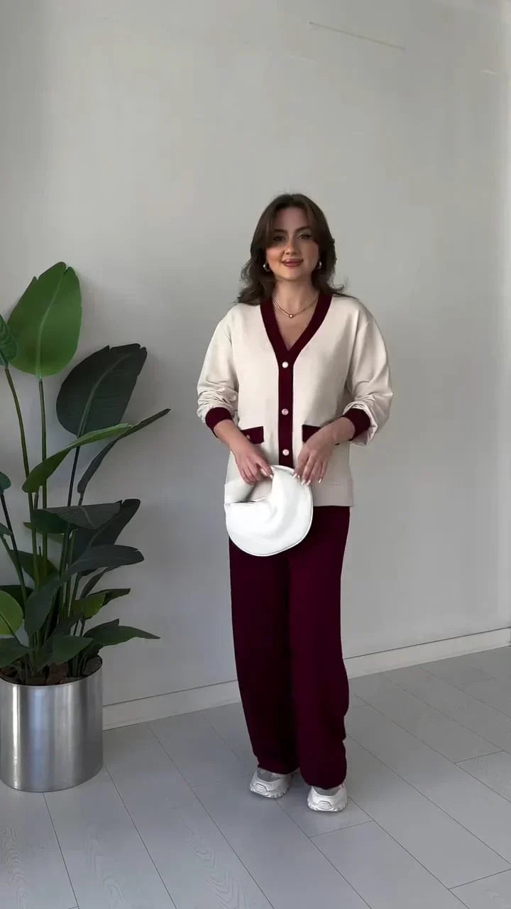 ELEGANT CONTRAST DAT IN HET OOG VALT – Subtiele kleurvlakken blazen deze set nieuw leven in en vormen een balans tussen moderne stijl en ingetogen elegantie. Doordachte knoopdetails voegen diepte en charme toe, waardoor je look een gepolijste afwerking krijgt die zowel verfijnd als toegankelijk aanvoelt.
