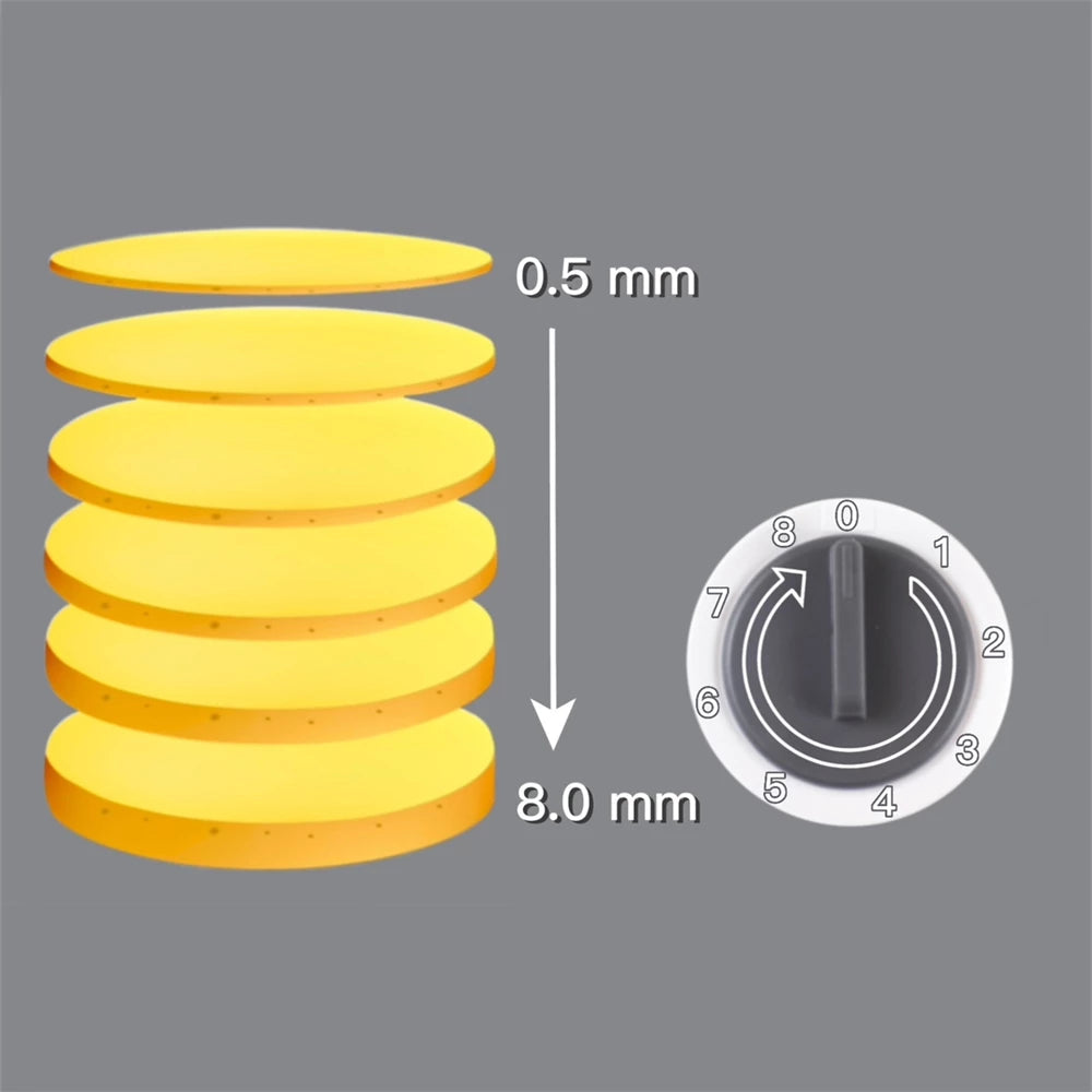 [Multifunctioneel] De messen bieden flexibiliteit om gemakkelijk fruit en groenten in vormen en maten te snijden, snijden, versnipperen en hakken. Zoals een aardappel, je kunt er gemakkelijk golvende of normale plakjes van maken, reepjes maken of pureren.