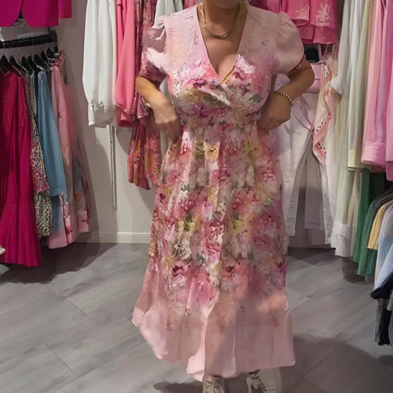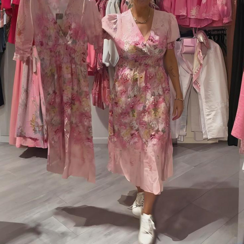 ELEGANT BLOEMENPRINT – De zachtroze basis met romantische bloemenprints creëert een moeiteloos chique look, perfect voor bruiloften, tuinfeesten, dates of weekenduitjes.